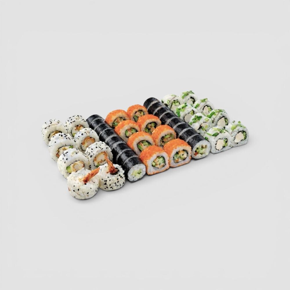 Чикен терияки - 8 шт, вегас - 8 шт, калифорния классик - 8 шт, банзай классик - 8 шт, маки с огурцом - 8 шт.