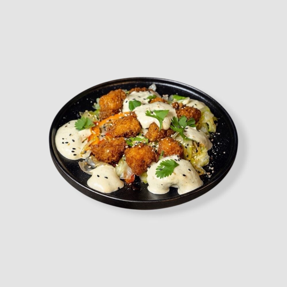 Филе цыпленка, овощи, грибы Муэр, соус тар-тар, кинза, кунжут