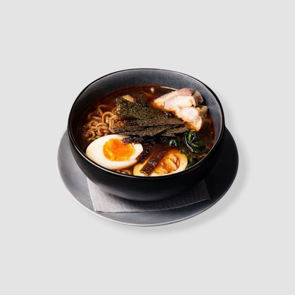 Рамен бульон, куриный рулет, лапша Рамен, яйцо, лук