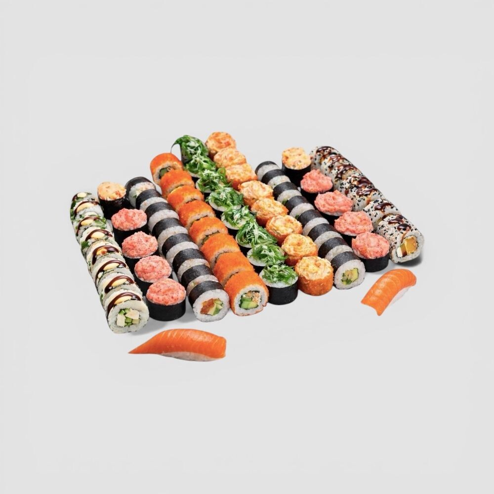Чикен терияки - 8 шт, маки с копченым лососем - 8 шт, калифорния классическая - 8 шт, маки с огурцом - 8 шт, спайси лосось - 8шт, вегас - 8 шт, банзай классик - 8 шт, овощной с тунцом - 8 шт, суши с лососем - 2 шт, гункан спайси краб - 2 шт.