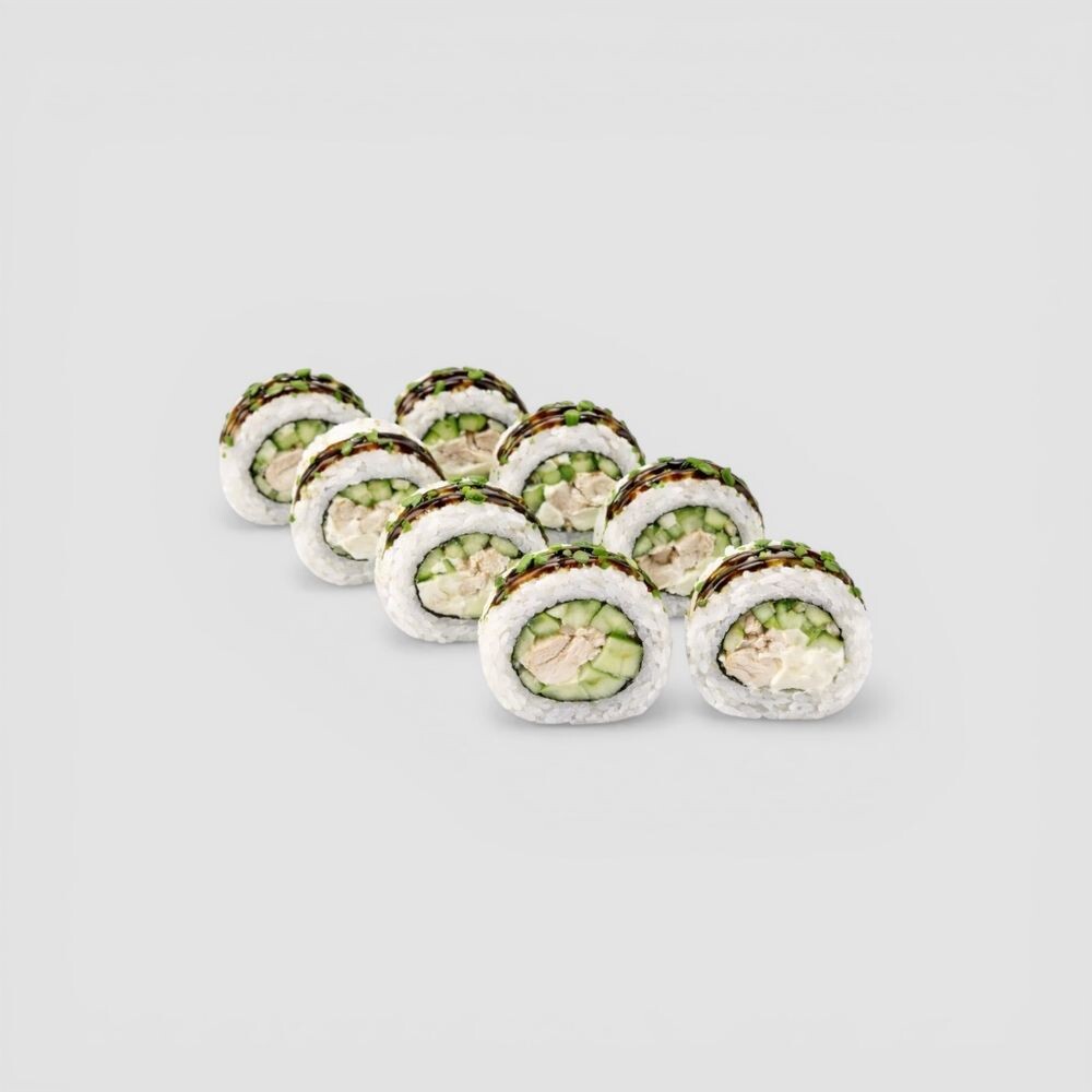 филе цыпленка, сливочный сыр, огурец, лук зеленый, соус спайси, соус Унаги