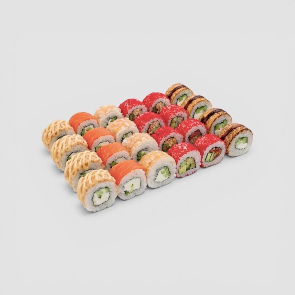 Филадельфия с креветкой - 4 шт, филадельфия лайт - 4 шт, филадельфия запеченная - 4 шт, филадельфия с крабом - 4 шт, калифорния классическая - 4 шт, калифорния с лососем - 4 шт.
